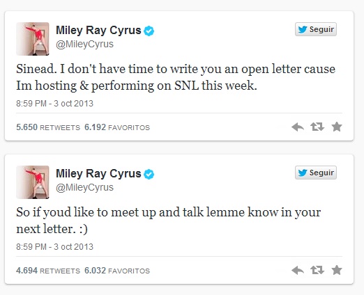 Miley Cyrus se valió de su cuenta de Twitter para responderle a Sinead O’Connor, luego que la cantante irlandesa aconsejase a la ex estrella de Disney a “no dejar que el negocio de la música haga una prostituta de ti“, haciendo caso omiso a sus palabras.