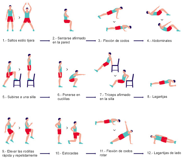 Realiza intervalos de 20 segundos de estos 12 ejercicios y descansa 5 segundos entre cada uno.