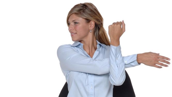 Sentada sobre una silla, con la espalda erguida y los hombros relajados, sostené con la mano izquierda el brazo derecho extendido y presioná el codo hacia el cuerpo, llevando el mentón hacia la derecha. Mantené 30 segundos y repetí con el otro brazo.