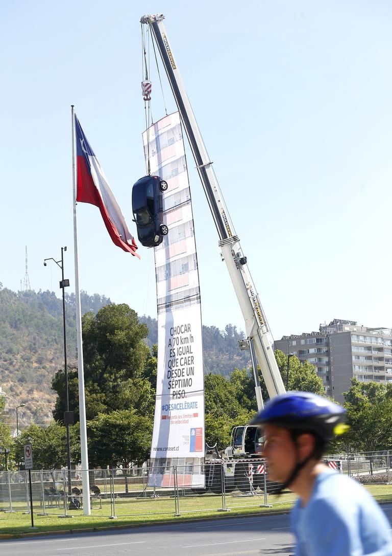 Y para graficar aquello, puso en Plaza Italia un automóvil colgado de una grúa a la altura de un séptimo piso porque la caída desde esa altura es la misma fuerza que genera un choque a alta velocidad.