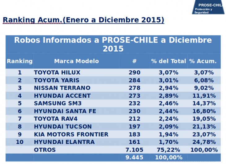 Un ranking no muy favorable encabezan las camionetas Toyota Hilux, que se convirtieron en las más robadas entre enero y diciembre de 2015 según informó la Asociación de Aseguradores, Prose-Chile.