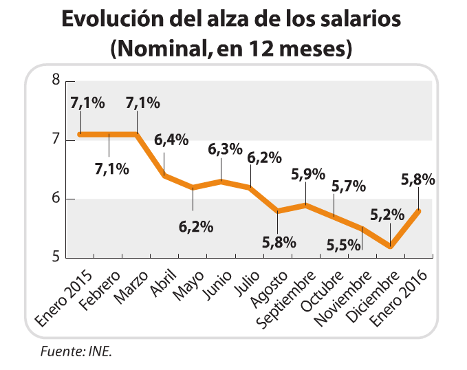 El año pasado, tras un inicio de fuerte alza de los salarios, con un 7,1% el primer mes, se terminó en diciembre con un registro de sólo un 5,2% de incremento nominal.