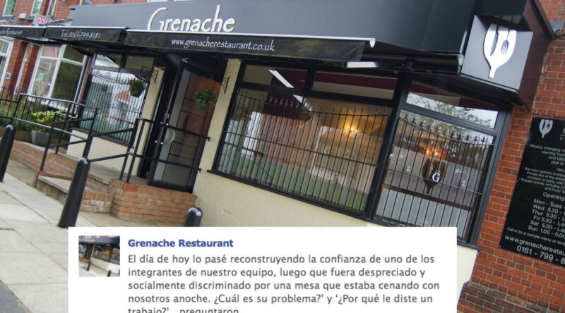 Hace unos días, algunos arrogantes comensales llegaron al restaurante Grenache en Manchester, Inglaterra, para disfrutar una buena cena. Sin embargo, cuando el mesero comenzó a atenderlos, el grupo lucía realmente incómodo, por lo que el dueño, Mike Jennings, tuvo que intervenir.