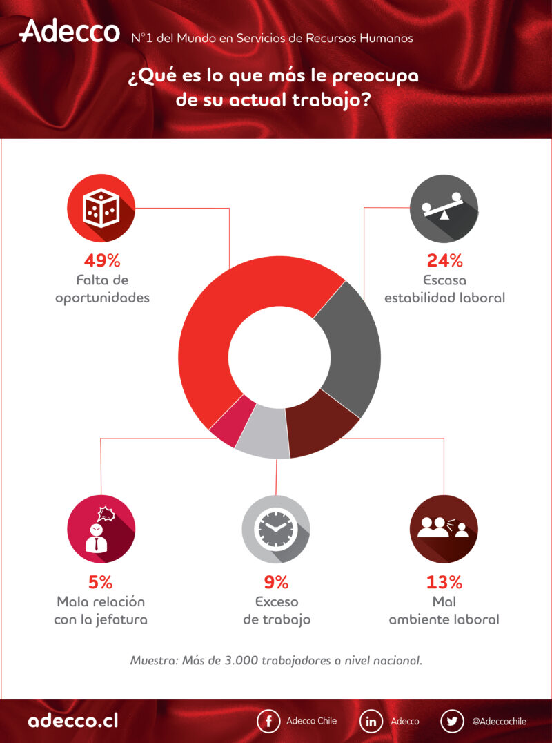Según un estudio realizado por Adecco, empresa N° 1 del mundo en servicios de Recursos Humanos, al 49% de los encuestados les preocupa la falta de oportunidades presentes en su actual trabajo, este porcentaje representa un 3% más que el arrojado por la misma encuesta hace 12 meses atrás.