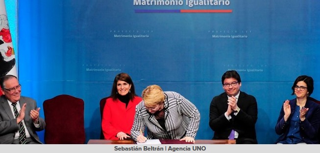 Asimismo, la presidenta Bachelet dijo que “un niño o niña podrá ser adoptado indistintamente por un matrimonio heterosexual u homosexual, por el solo hecho de ser cónyuges, sin necesidad de modificar la ley de adopciones”.