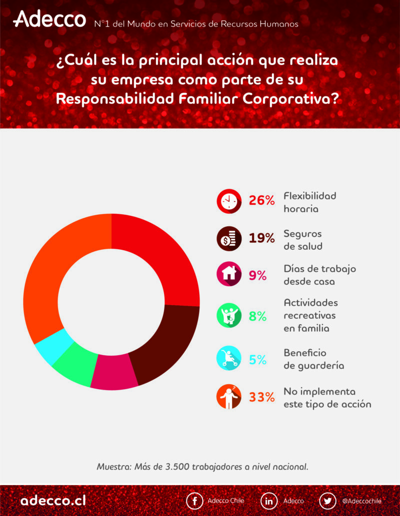 De acuerdo a los resultados de esta encuesta, la acción que más predomina es la flexibilidad horaria (26%), seguida de los seguros de salud (19%) y en menor medida las empresas otorgan días de trabajo desde casa (9%), actividades recreativas en familia (8%) y beneficio de guardería (5%). La ejecutiva de Adecco señala que “las empresas cada día se van a ir adecuando a las necesidades de una fuerza laboral más joven, innovadora y que está demandando una mayor independencia, satisfacción laboral y equilibrio entre la  vida profesional y personal”.