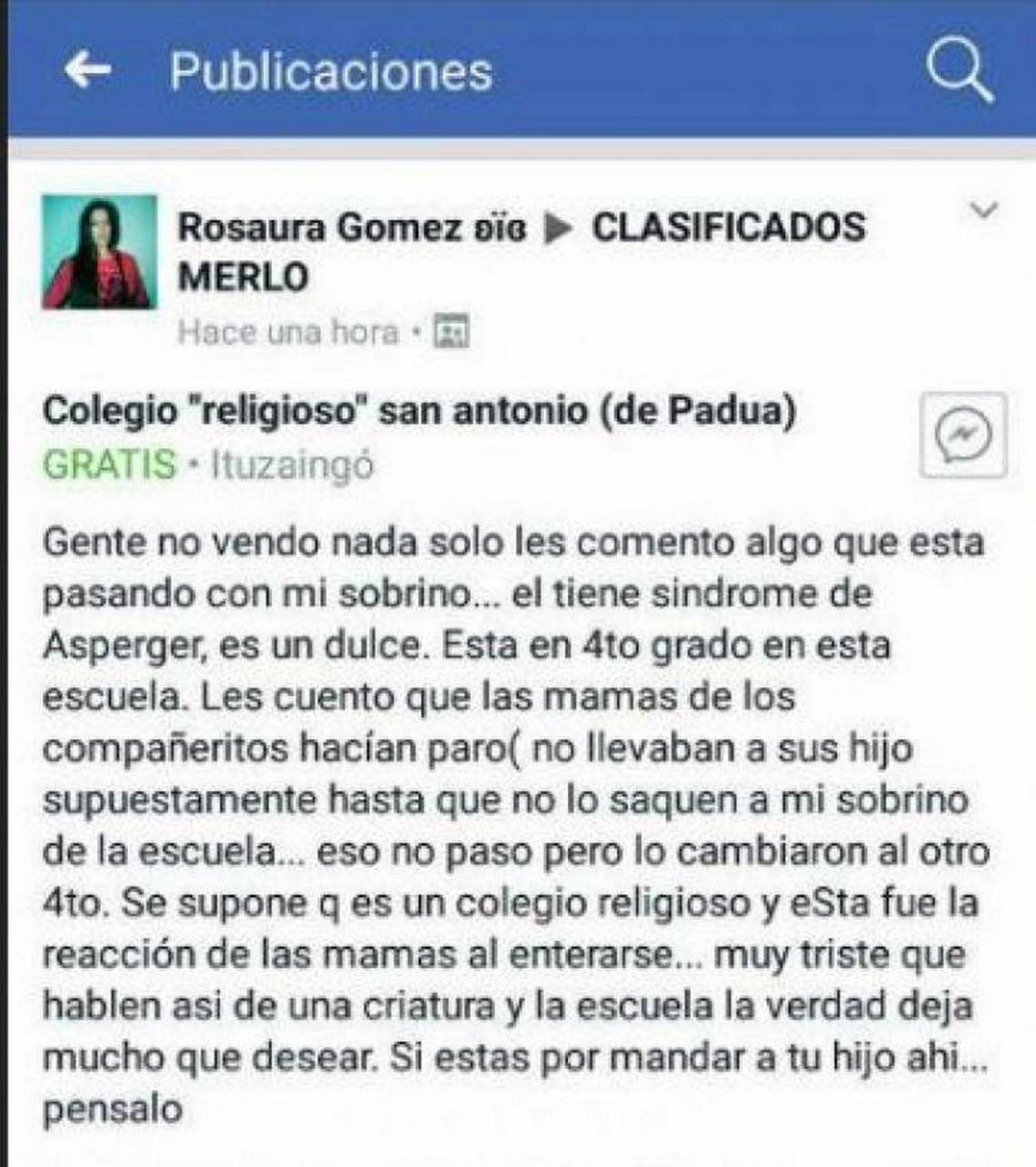 La mujer, identificada como Rosaura Gomez, publicó en Facebook: “Él tiene síndrome de Asperger, es un dulce. Está en cuarto grado en esta escuela. Les cuento que las mamás de los compañeritos hacían paro (no llevaban a sus hijos supuestamente hasta que no saquen a mi sobrino de esa escuela). Eso no pasó, pero lo cambiaron al otro cuarto. Se supone que es un colegio religioso y esta fue la reacción de las mamás al enterarse… muy triste que hablen así de una criatura y la escuela, la verdad que deja mucho que desear”.