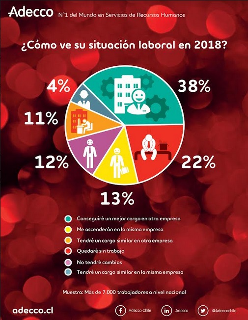 Según un estudio realizado con más de 7.000 trabajadores a nivel nacional por Adecco Chile, empresa N°1 del mundo en Servicios de Recursos Humanos, el 51% de los encuestados cree que tendrá un ascenso laboral durante 2018. De ellos, un 13% piensa que será promovido en la misma compañía, mientras que el 38% que conseguirá un mejor cargo en otra empresa.