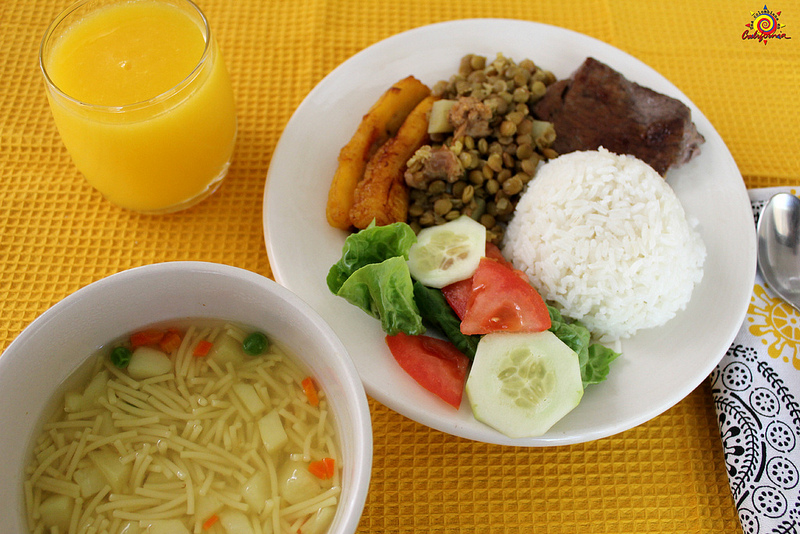 Todo eso va acompañado de sopa, jugo, pan, ensalada y postre.