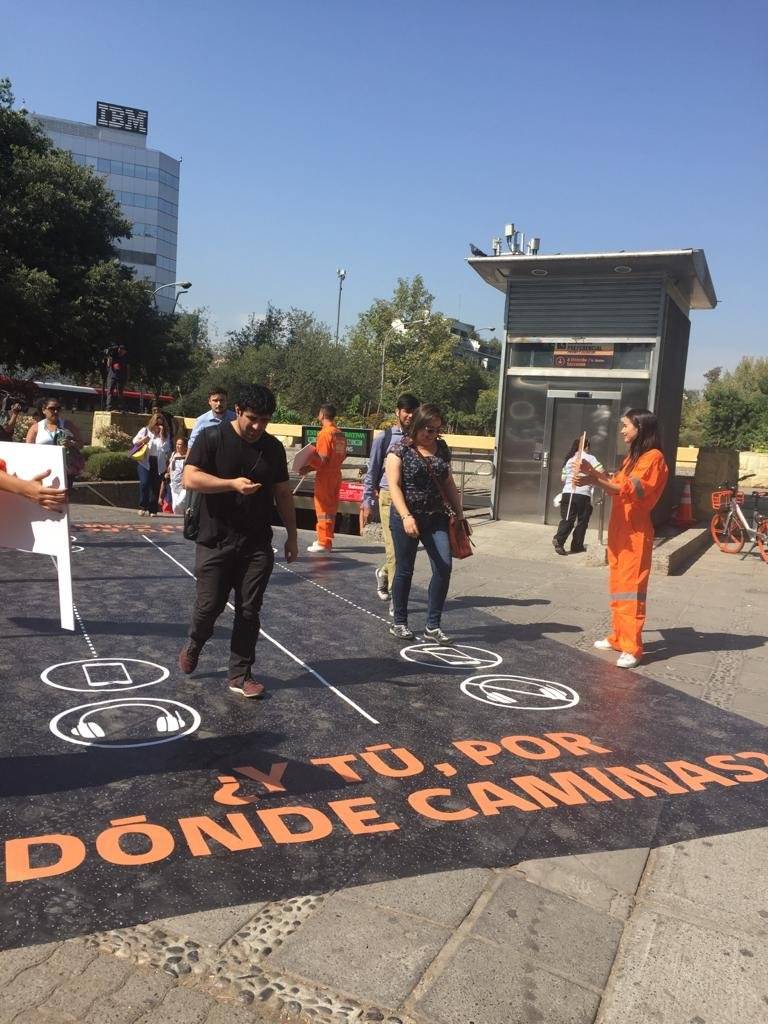 Para esto se realizó una intervención urbana que consistió en la instalación de un sticker gigante en el piso para delimitar una pista exclusiva para personas que transitan atentas a la caminata y otra para quienes se distraen con elementos como el teléfono. Con la ayuda de monitores, se les pidió a los peatones que eligieran la pista por la cual preferían transitar y así poder explicar que la finalidad de esta intervención es que se tome conciencia de que debemos caminar seguros.