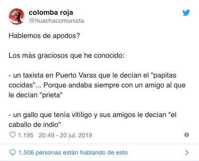 La autora del hilo esta vez fue la tuitera @huachacomunista quien escribió «Hablemos de apodos? Los más graciosos que he conocido: – un taxista en Puerto Varas que le decían el «papitas cocidas»… Porque andaba siempre con un amigo al que le decían «prieta» – un gallo que tenía vitíligo y sus amigos le decían «el caballo de indio»».