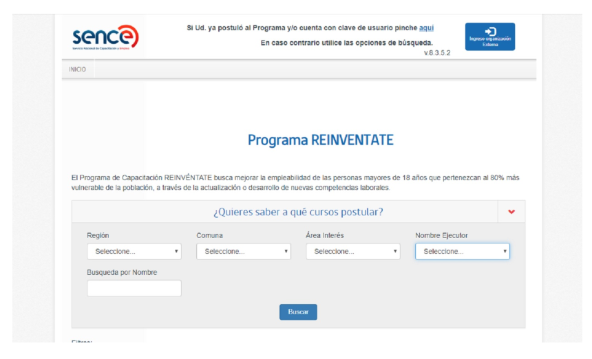 En él puedes realizar una búsqueda por región, comuna, área de interés, la OTEC que lo ejecuta o por nombre.