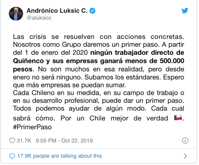 Luksic, detalló en su cuenta personal de Twitter que «las crisis se resuelven con acciones concretas. Nosotros como Grupo daremos un primer paso. A partir del 1 de enero del 2020 ningún trabajador directo de Quiñenco y sus empresas ganará menos de 500.000 pesos».