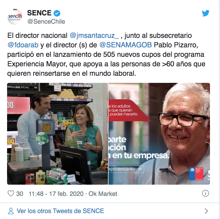 El Ministerio del Trabajo y el Servicio Nacional de Capacitación y Empleo (Sence) lanzaron este lunes una nueva versión de «Experiencia Mayor 2020», programa gubernamental que busca promover la contratación de personas de 60 años o más y que este año dispondrá de un total de 505 cupos en todo el país.