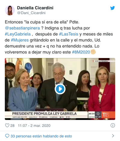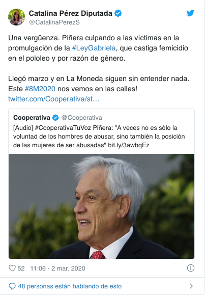 Quien también criticó las palabras del Mandatario fue José Antonio Kast: «Presidente: la culpa no es de las mujeres sino de aquellos que las matan, violan, golpean o abusan de ellas. Nuevamente, una declaración inaceptable».
