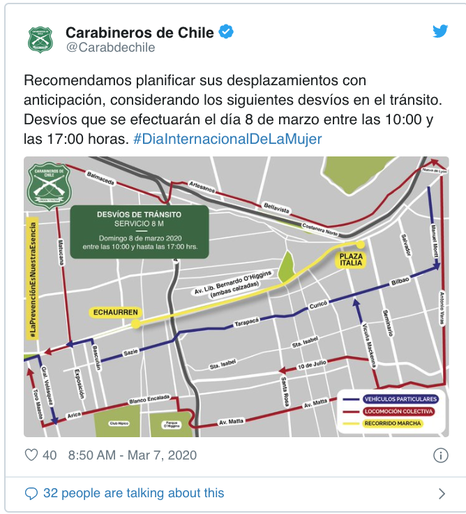 “Recomendamos planificar sus desplazamientos con anticipación, considerando los siguientes desvíos en el tránsito. Desvíos que se efectuarán el día 8 de marzo entre las 10:00 y las 17:00 horas. #DiaInternacionalDeLaMujer”, puso la institución uniformada en su cuenta de Twitter.