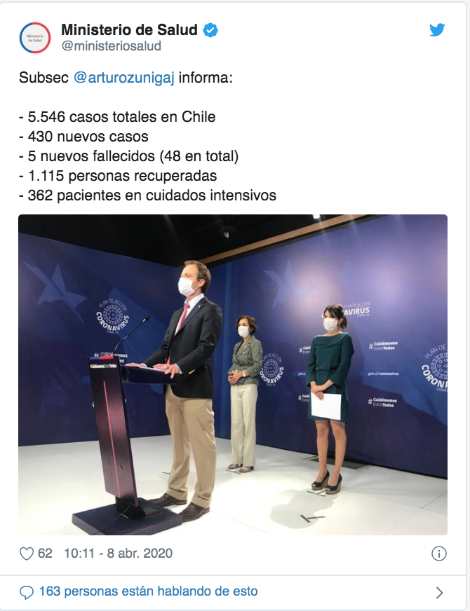 El subsecretario de Redes Asistenciales, Arturo Zúñiga, confirmó 430 nuevos casos de contagios por coronavirus, elevando la cifra total a 5.546 personas con Covid-19.