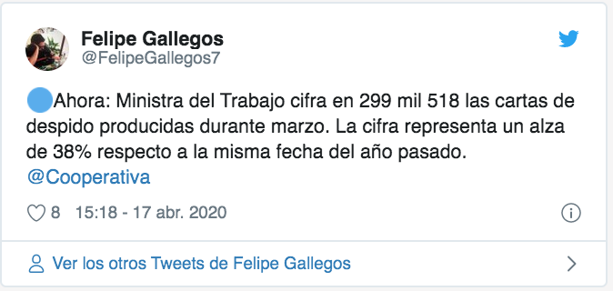 La autoridad, además, confirmó que en lo que va de abril ha habido un total de 81.087 solicitudes a la Administradora de Fondos de Cesantía (AFC) por despidos, un 17 por ciento más respecto al año anterior, sin considerar las empresas que se han acogido a la Ley de Protección al Empleo.