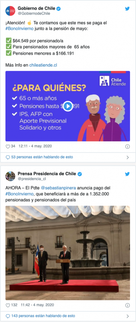 «Aquellos que reciben su pensión en forma presencial, van a recibir este bono invierno en la misma forma en que reciben habitualmente su pensión», comentó Piñera.