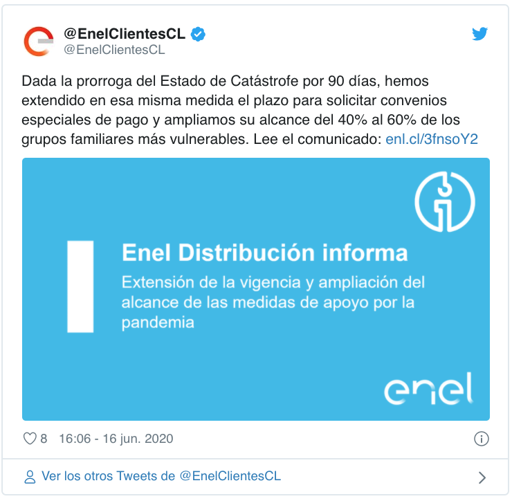En el actual contexto, Enel Distribución ha extendido en esa misma medida el plazo para solicitar sus convenios especiales de pago por la pandemia, junto con ampliar su alcance desde el 40% al 60% de los grupos familiares más vulnerables, de acuerdo al Registro Social de Hogares, para aquellos que así lo soliciten.
