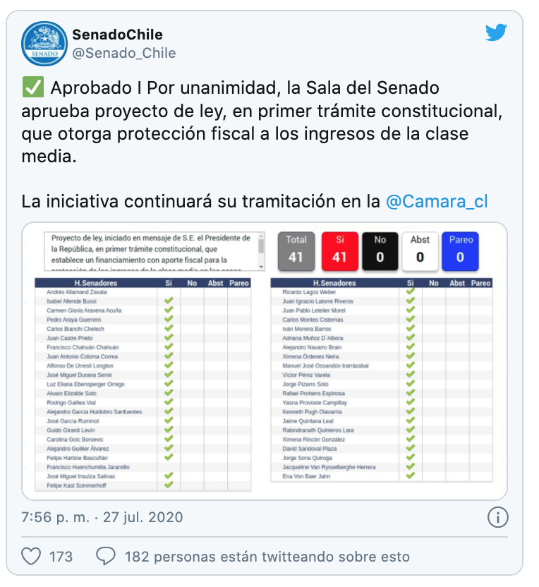 La Sala del Senado aprobó este lunes por unanimidad el proyecto del plan fortalecido para la clase media del Ejecutivo, que incluye un bono de 500 mil pesos.