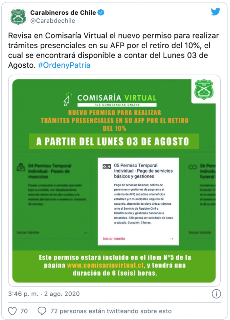 Para las comunas que se encuentran afectadas por medidas restrictivas de movimiento, se habilitó un nuevo permiso en la Comisaría Virtual de Carabineros.