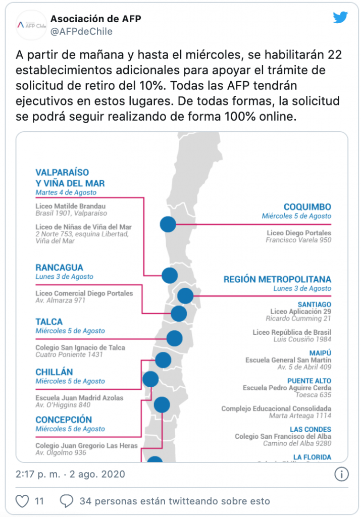 Desde este lunes se podrá realizar presencialmente el trámite para solicitar el retiro del 10% de los fondos de pensión, proceso que contará con un total de 22 puntos de atención desde Arica hasta Puerto Montt.