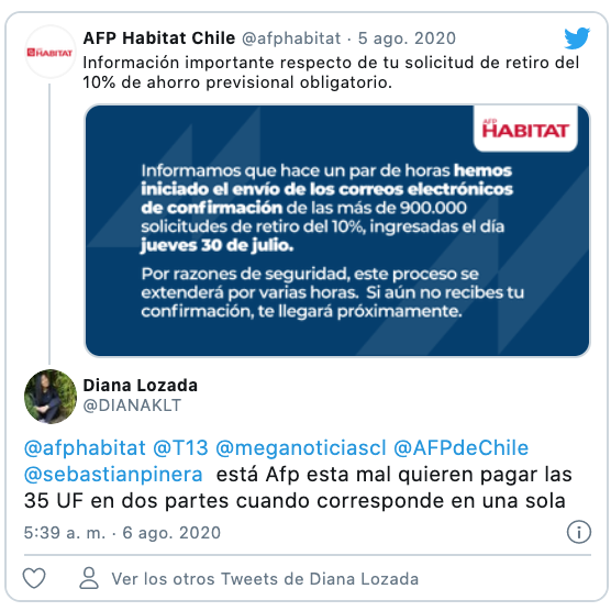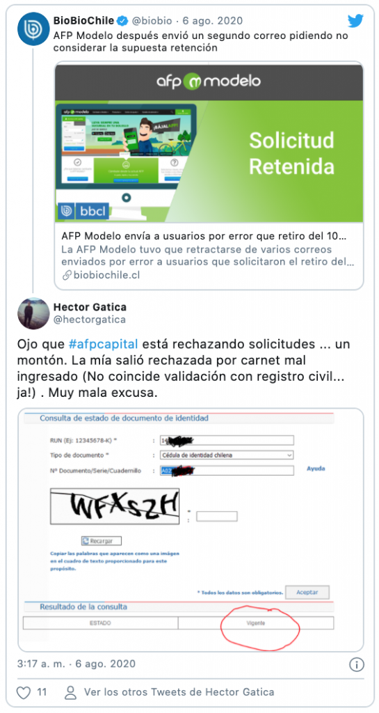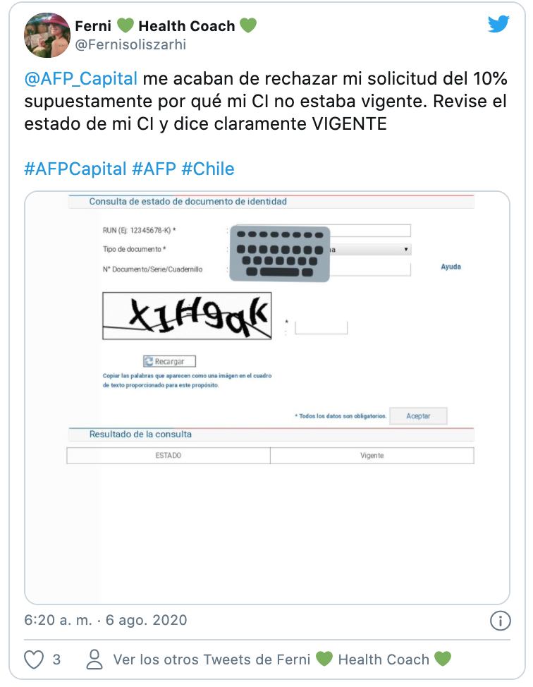 En redes sociales, usuarios de AFP Capital, manifestaron que su solicitud del retiro de los fondos previsionales fue rechazada debido a que los datos de la cédula de identidad no coinciden con con la validación del Registro Civil.