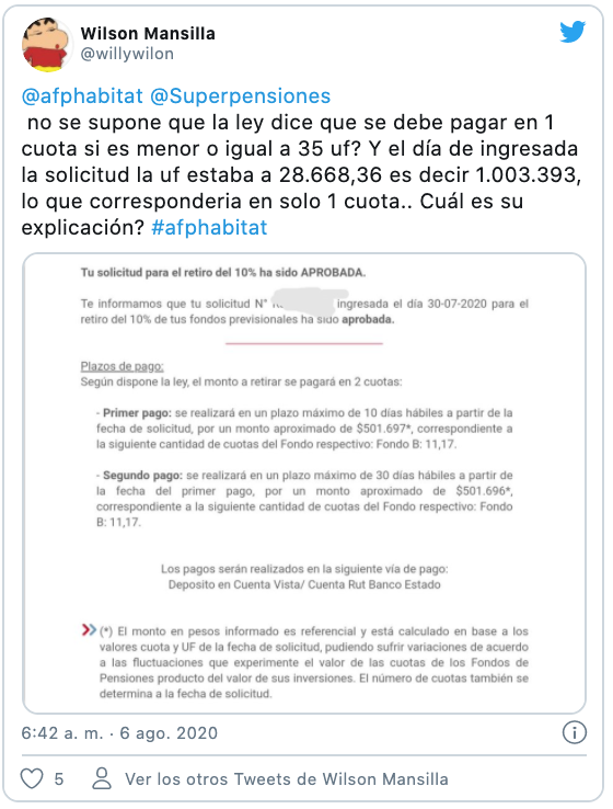 En el caso de que el monto a retirar sea inferior o hasta las 35 UF ($1 millón), este se pagará íntegramente en una sola cuota a los 10 días hábiles desde la solicitud de retiro.