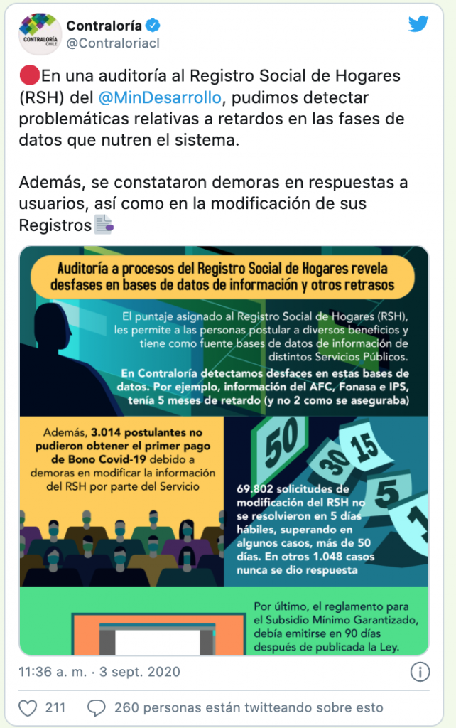 En una auditoría realizada al RSH del Ministerio de Desarrollo Social y Familia, el órgano fiscalizador encontró que 3.014 postulantes no pudieron obtener el primer pago del Bono COVID-19 debido a demoras en la modificación de la información.