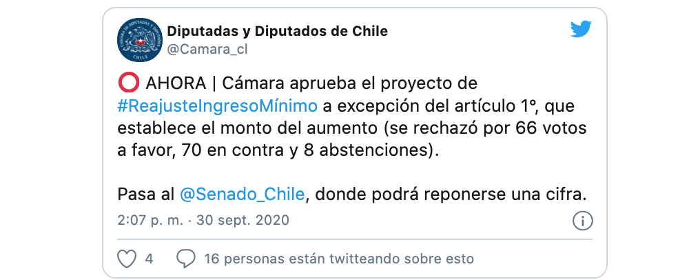 La Cámara de Diputados rechazó por 66 votos a favor, 70 en contra y ocho abstenciones el aumento de los 6.000 pesos del sueldo mínimo, por lo que el proyecto pasará al Senado sin el monto comprometido por el Gobierno.