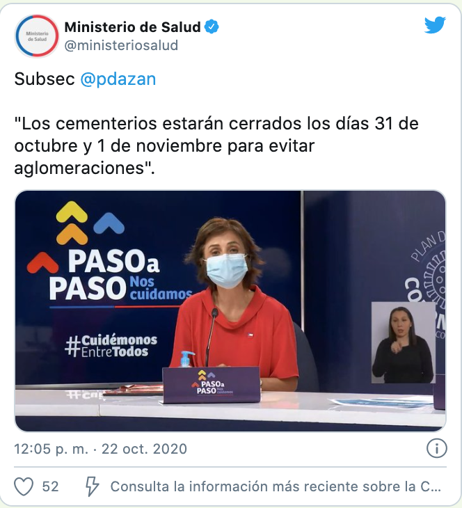 En la misma línea, el ministro Enrique Paris recomendó que “las personas que quieran ir a visitar a sus seres queridos que han fallecido, lo hagan durante la semana en horarios que puedan concurrir”.