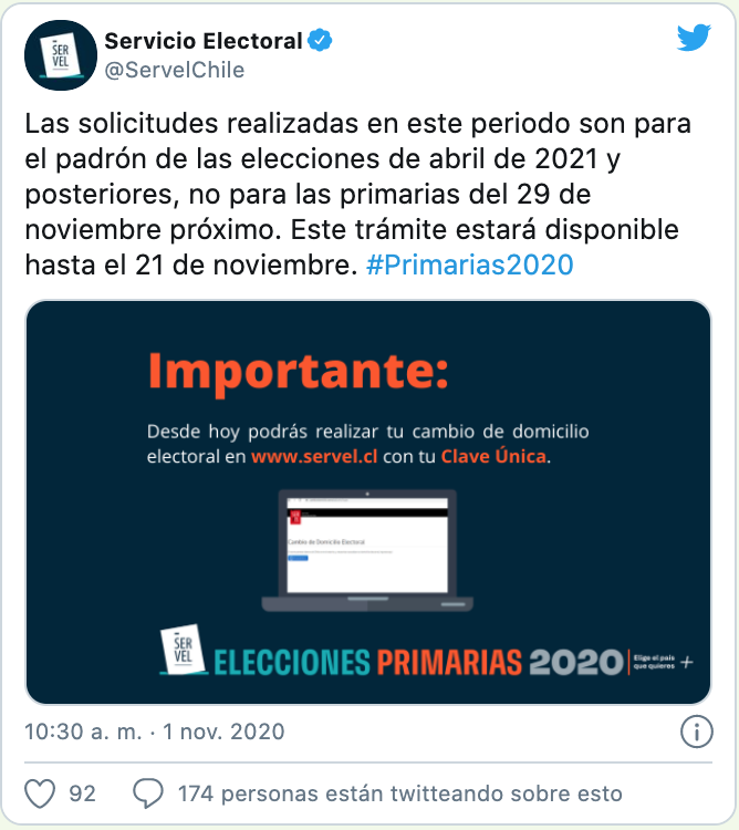 El próximo 11 de abril se llevarán a cabo las votaciones para definir a los integrantes de la Convención Constituyente, así como también a los alcaldes, concejales y gobernadores provinciales. El plazo para hacer el cambio es hasta el 21 de noviembre.