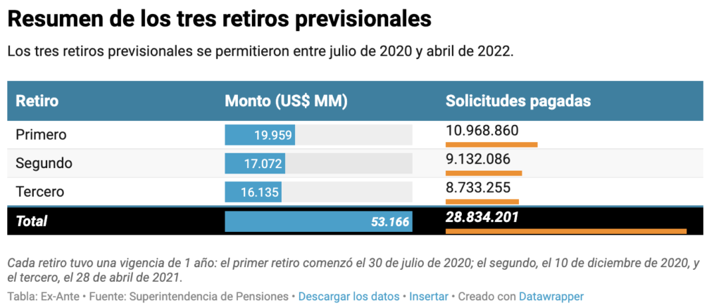 - El tercer retiro se reguló mediante la Ley Nº 21.330 y su vigencia partió el 28 de abril de 2021. Fueron 8,7 millones de solicitudes ya cursadas, por un monto final de US$ 16.135 millones en total. A diferencia de los anteriores, aquí se sumó el llamado “anticipo de rentas vitalicias”, que implicó obligar a empresas privadas a extraer recursos de sus propios patrimonios (en los retiros desde las AFP, en cambio, las personas reducían su propio capital). Debido a eso hay al menos dos compañías de seguros de vida en litigio contra el Estado.