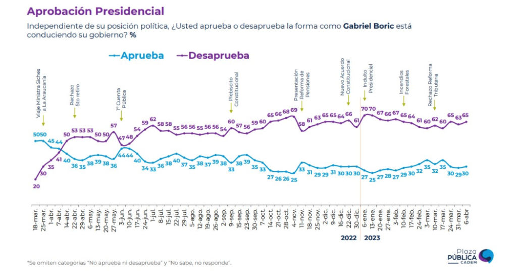 En los primeros días del mes, ante la consulta «Independiente de su posición política, ¿Usted aprueba o desaprueba la forma como Gabriel Boric está conduciendo su gobierno?«, un 30% apoya su gestión, cifra que se mantiene estable desde la versión anterior.