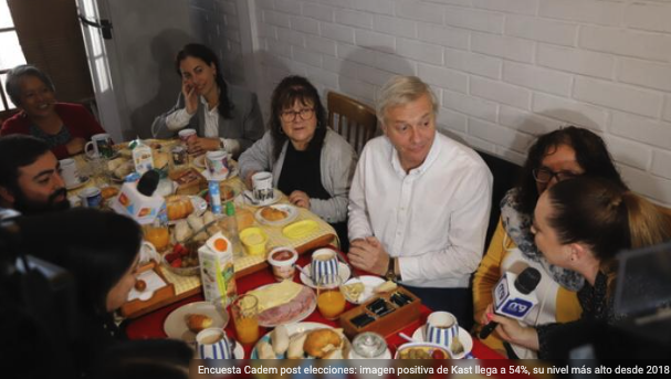 Su intención de voto subió de 20% a 27% en la última semana, liderando la carrera presidencial. A su vez, un 47% de quienes votaron por los republicanos lo hicieron por su “mano dura” frente a la delincuencia, narcotráfico y migración y un 56% cree que el gran perdedor de la elección fue Gabriel Boric.
