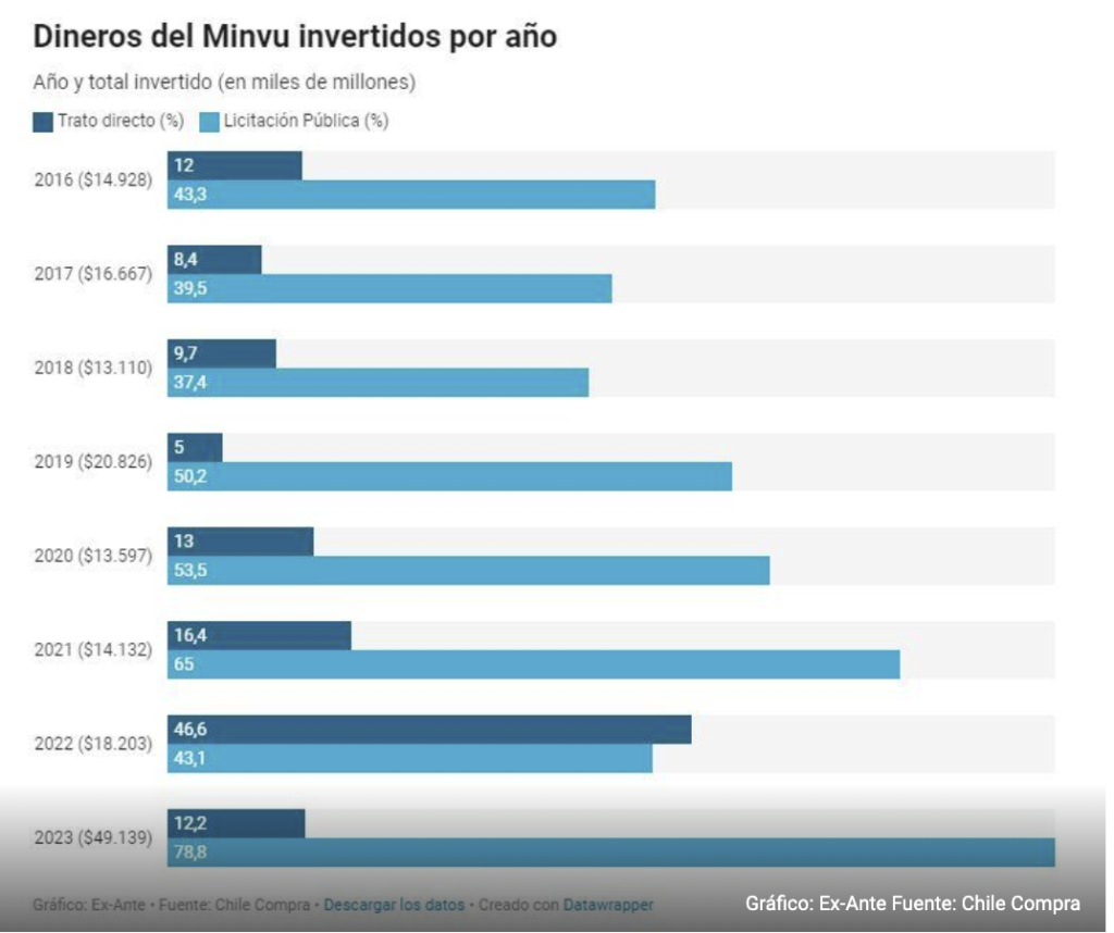 Qué ha ocurrido en 2023. El porcentaje de los montos transados vía trato directo por la Subsecretaría de Vivienda ha sido de 12,2%, mucho menos que el del año anterior.