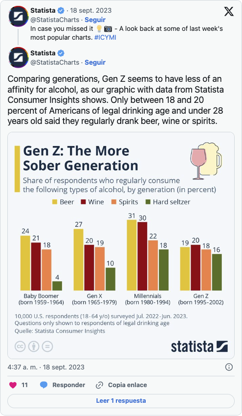 Un nuevo estudio de estadísticas realizado por Statista, una de las mayores plataformas de datos del mundo, reveló que la Generación Z sería la que tiene menos afinidad por el alcohol en la actualidad.