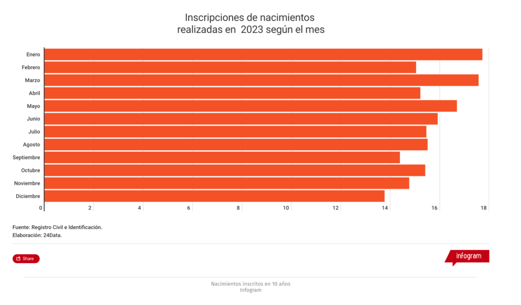 La cifra de nacimientos inscritos entregadas por el Registro Civil a 24Data es la segunda más baja en una década.
