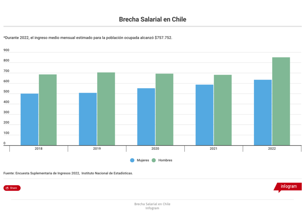 Según la encuesta, los hombres percibieron un ingreso medio de $850.412; mientras que la mayoría de las mujeres recibió un $633.334. Además, entre 2021 y 2022 el ingreso promedio de los hombres aumentó en $101.366. En tanto, el de las mujeres subió en $47.156.