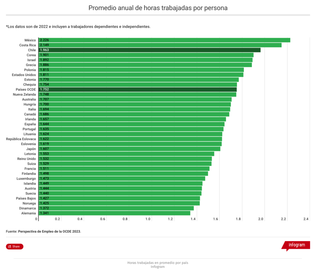 De acuerdo al informe «Perspectiva de Empleo de la OCDE 2023» Chile es el tercer país donde más horas se trabaja en promedio de manera anual, solo después de México y Costa Rica.