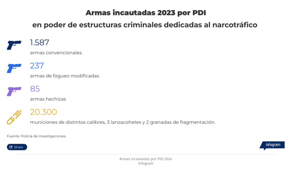 Ahora, según datos entregados por la policía a 24Data, hasta fines de junio de este año la PDI ha incautado 614 armas
