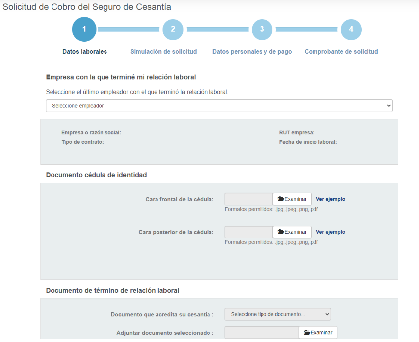 En esta misma página podrás encontrar la opción de «Solicitud de Cobro del Seguro de Cesantía», en donde deberás seleccionar tu último empleador, así como también entregar los datos laborales, personales y de pago.