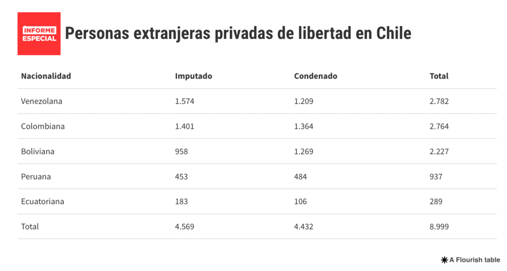 El documento oficial que reveló dicha información, y que fue enviado durante este miércoles a la Fiscalía Nacional, también reportó que la mayor cantidad de reos extranjeros en las cárceles son de nacionalidad venezolana (2.782).