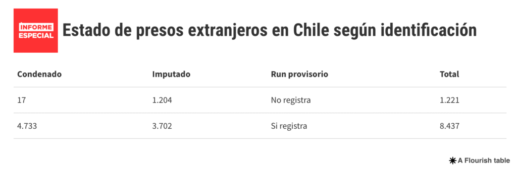 Al margen, actualmente los penales chilenos albergan a 9.658 presos foráneos. Pero, de ellos, sólo 8.437 cuentan con su RUN provisorio.