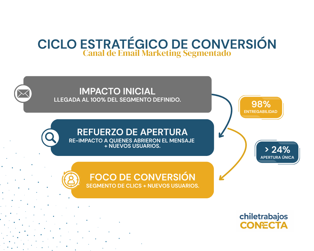 Muchos creen que el marketing directo es un evento único. En Chiletrabajos Conecta, entendemos que la conversión es un proceso. Por ello, nuestro Canal de Email Marketing Segmentado no funciona bajo la lógica del envío masivo de bajo costo, sino a través de Ciclos Estratégicos de mínimo dos meses.