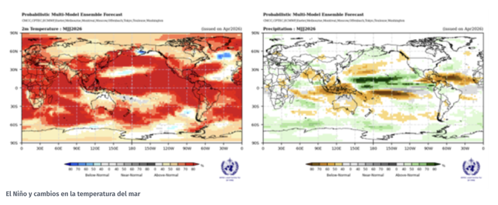 «Las temperaturas de la superficie del mar están aumentando rápidamente, y ello sugiere que ya entre los meses de mayo y julio de 2026 es probable que vuelvan a darse condiciones características de un episodio de El Niño«, aseguró.